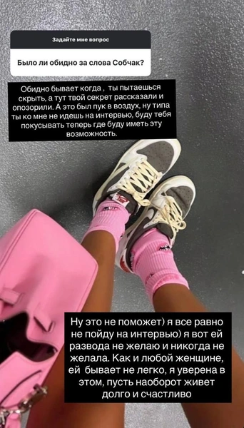 «Обидно бывает, когда ты пытаешься что-то скрыть, но твой секрет рассказали, а тебя опозорили. А это был просто пук в воздух: типа ты ко мне не идешь на интервью, поэтому я буду тебя покусывать теперь, где будет возможность», — написала ведущая.