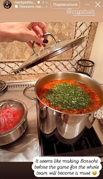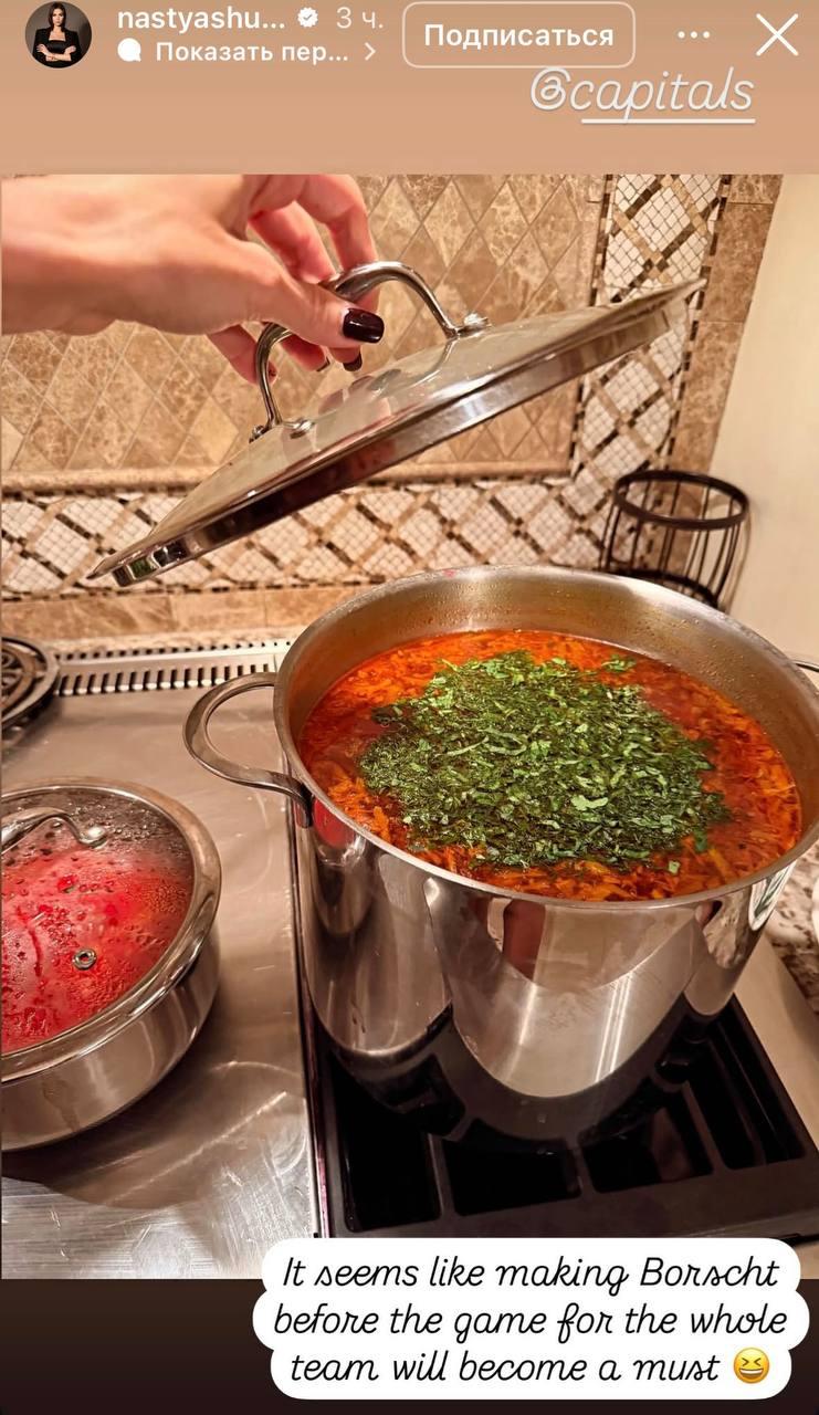 Позже, уже после победного матча, Анастасия поделилась сторис в соцсетях — опубликовала фото фирменного борща, приготовленного накануне, и с юмором написала: «Похоже, что приготовить борщ перед игрой для всей команды станет обязательным».